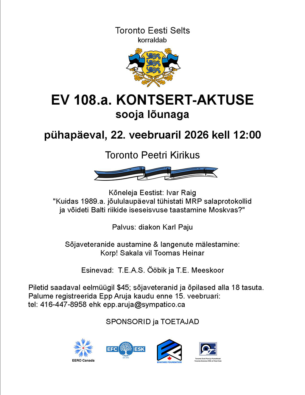 Toronto Eesti Selts korraldab EV 108.a. kontsert-aktuse sooja lõunaga pühapäeval, 22. veebruaril kell 12:00 Toronto Peetri kirikus.