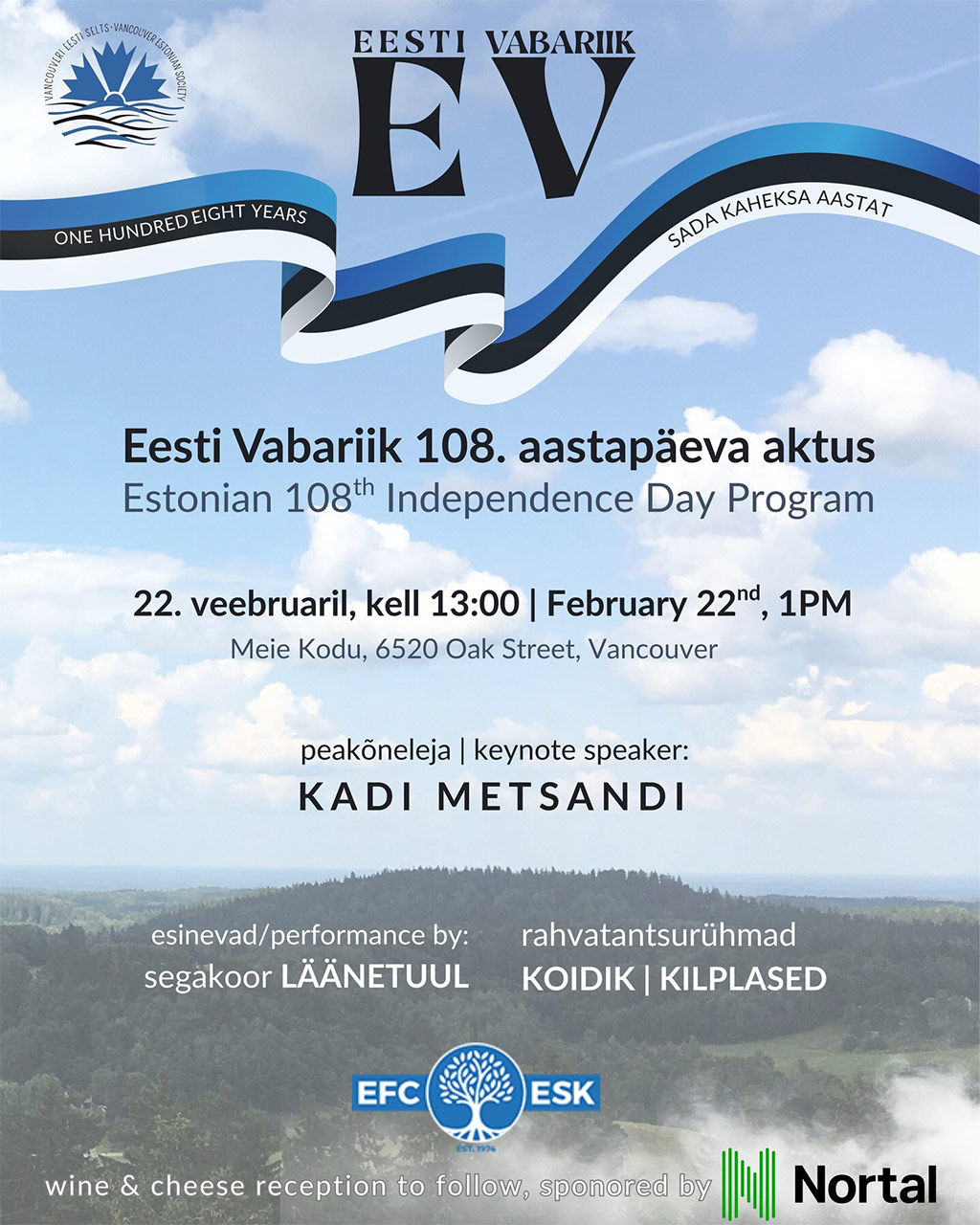 Sunday, February 22nd for VES' 108th Estonian Independence Day celebration at Meie Kodu!