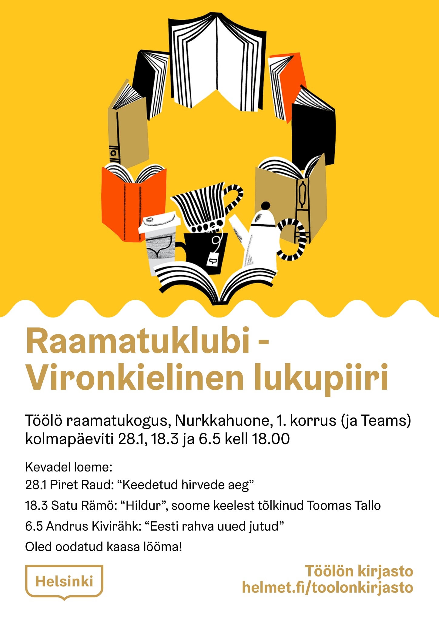 Raamatuklubisse on oodatud kõik kirjandushuvilised, kes soovivad oma lugemismuljeid jagada. Raamatuklubis võib osaleda kohapeal Helsingis Töölö raamatukogus või Teamsis.