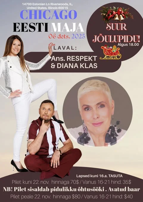 Come join us on December 6th to enjoy the company of your friends, a buffet dinner and dance to the music of “Ansambel Respekt with Diana Klas” from Estonia. The evening begins at 6pm with cocktails and dinner will be served at 8 pm. Vana Tallinn bar will be open (corkage fees charged if you bring your own liquor). Tickets are $70 per person (includes dinner) is reserved and paid before November 22nd. After November 22nd and at the door, ticket prices are $80 per person (children 16-21 tickets 1/2 price, under 16 free). Call Mailis at 847.668.5706 or the Estonian House at 720.378.6642 to make your reservation.